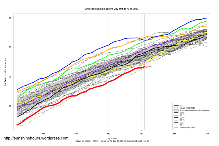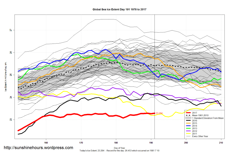 Sea Ice Extent (Global Antarctic and Arctic) – Day 191 – 2017 Published on July 11, 2017July 11, 2017 by sunshinehours1 South / North Share this: Click to share on X (Opens in new window) X Click to share on Facebook (Opens in new window) Facebook Like Loading... Related