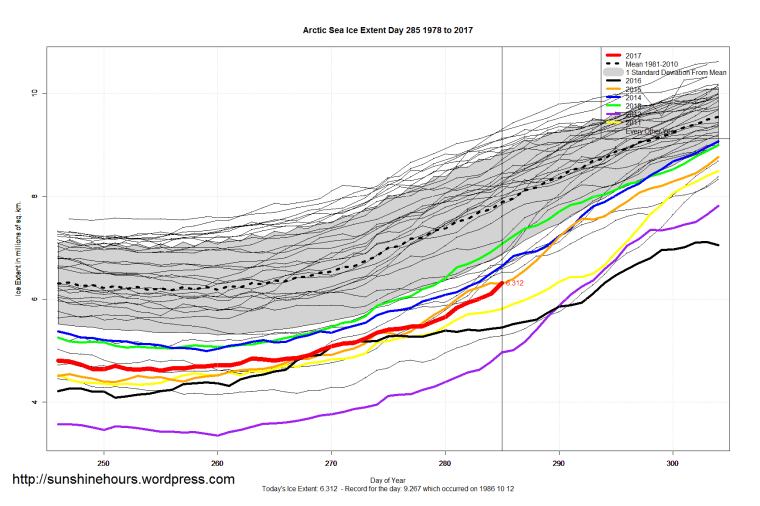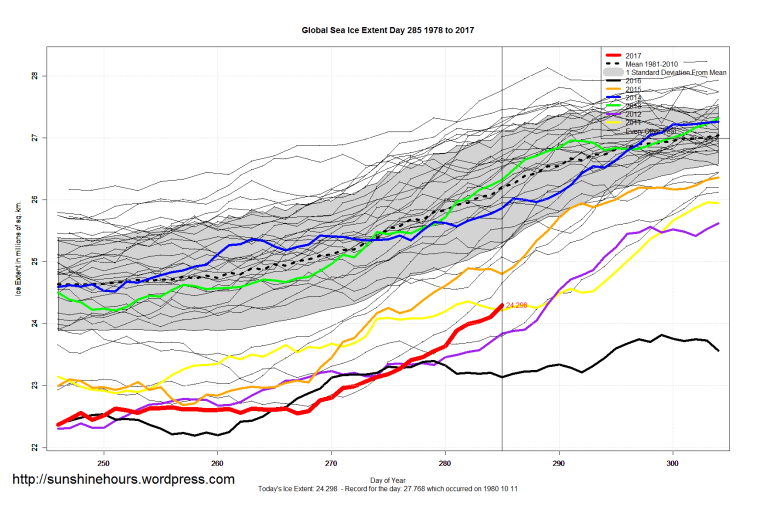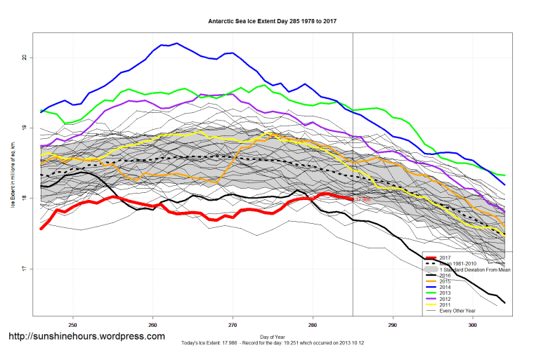 Sea Ice Extent (Global Antarctic and Arctic) – Day 285 – 2017 Published on October 13, 2017October 13, 2017 by sunshinehours1 I hadn’t noticed, but Antarctica on day 281 to 285 was back within one standard deviation for the first time in 1.5 months. South / North Share this: Click to share on X (Opens in new window) X Click to share on Facebook (Opens in new window) Facebook Like Loading... Related