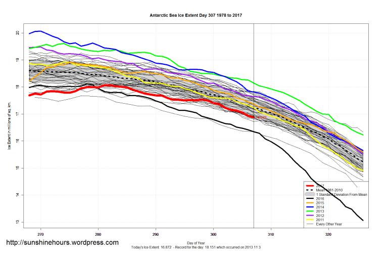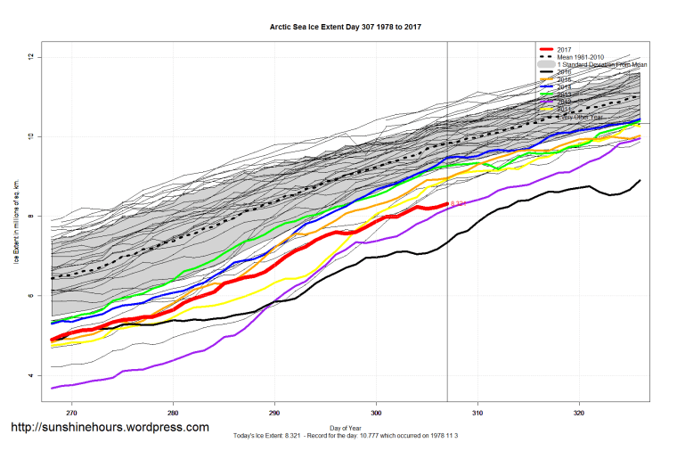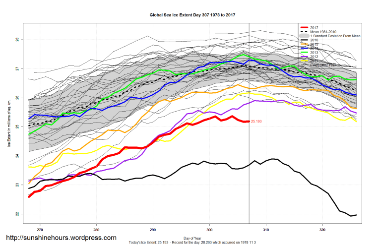 Sea Ice Extent (Global Antarctic and Arctic) – Day 307 – 2017 Published on November 4, 2017November 4, 2017 by sunshinehours1 All graphs are way higher on day 307 than they were on the same day in 2016. South / North Share this: Click to share on X (Opens in new window) X Click to share on Facebook (Opens in new window) Facebook Like Loading... Related