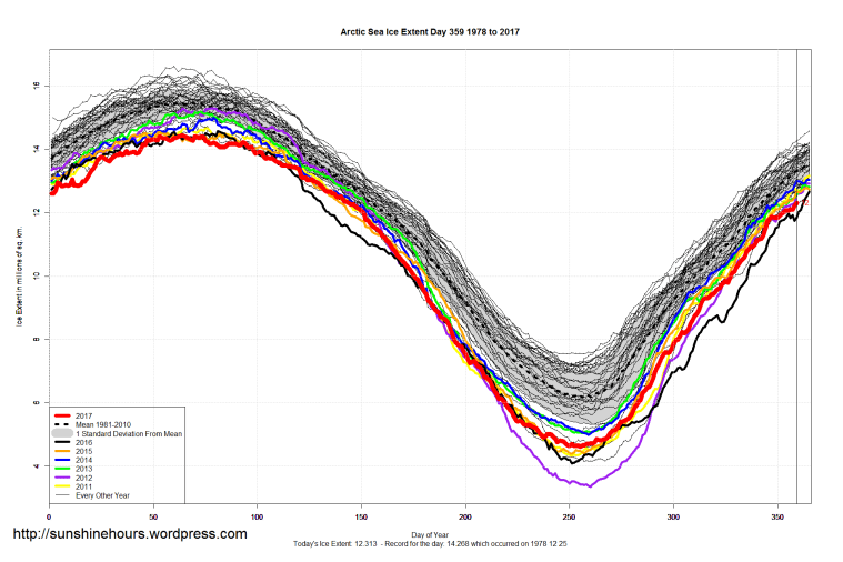 Sea Ice Extent (Global Antarctic and Arctic) – Day 359 – 2017 Published on December 26, 2017December 26, 2017 by sunshinehours1 South / North Share this: Click to share on X (Opens in new window) X Click to share on Facebook (Opens in new window) Facebook Like Loading... Related