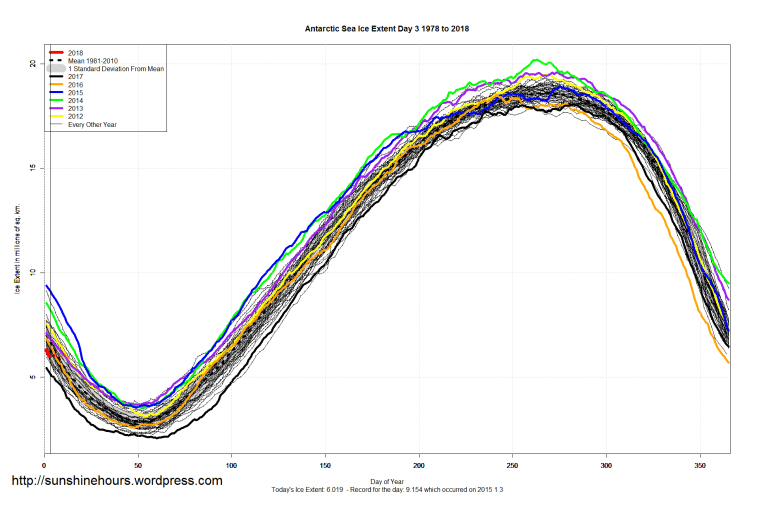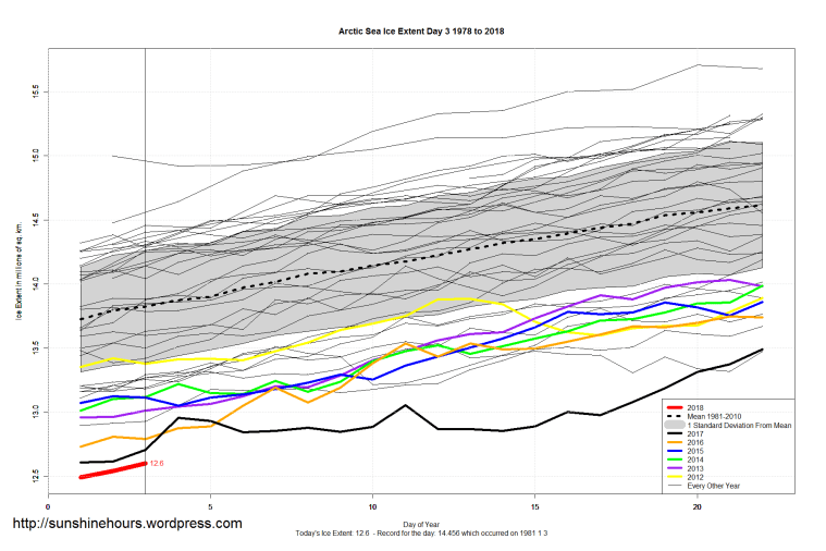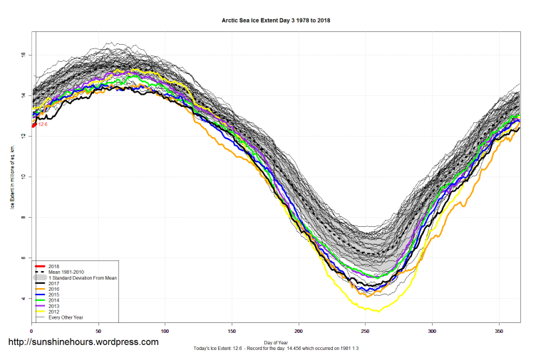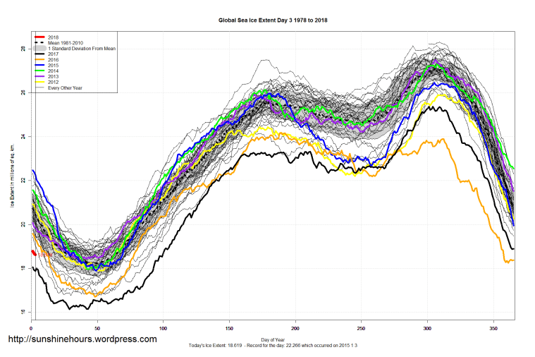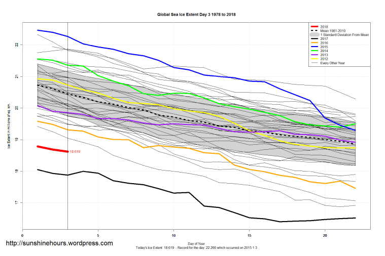 Sea Ice Extent (Global Antarctic and Arctic) – Day 3 – 2018 Published on January 4, 2018January 4, 2018 by sunshinehours1 South / North Share this: Click to share on X (Opens in new window) X Click to share on Facebook (Opens in new window) Facebook Like Loading... Related