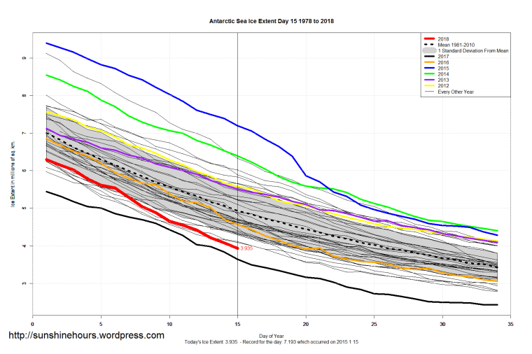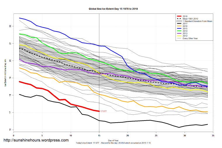 Sea Ice Extent (Global Antarctic and Arctic) – Day 15 – 2018 Published on January 16, 2018January 16, 2018 by sunshinehours1 South / North Share this: Share on X (Opens in new window) X Share on Facebook (Opens in new window) Facebook Like Loading... Related
