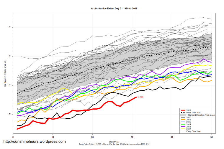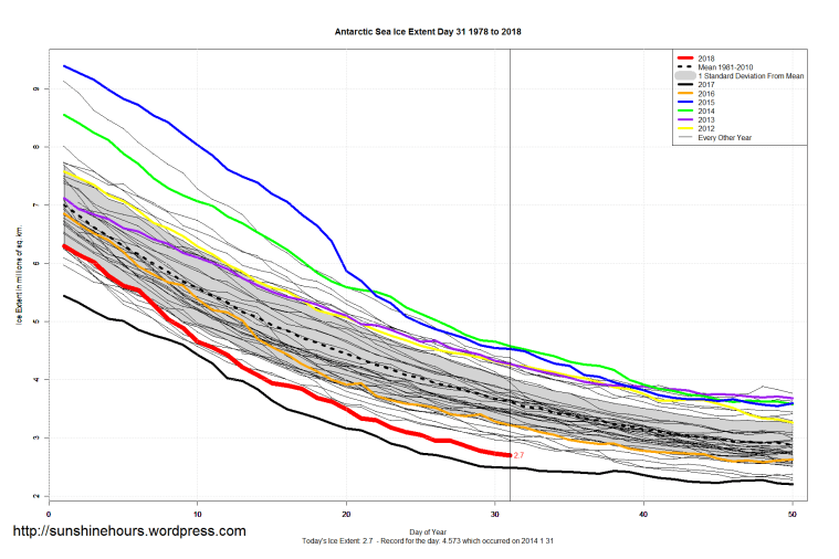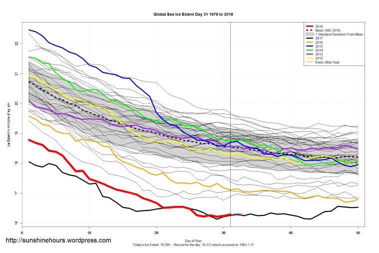 Sea Ice Extent (Global Antarctic and Arctic) – Day 31 – 2018 Published on February 1, 2018February 1, 2018 by sunshinehours1 South / North Share this: Click to share on X (Opens in new window) X Click to share on Facebook (Opens in new window) Facebook Like Loading... Related