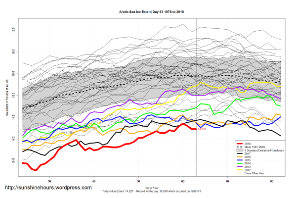 Sea Ice Extent (Global Antarctic and Arctic) – Day 63 – 2018