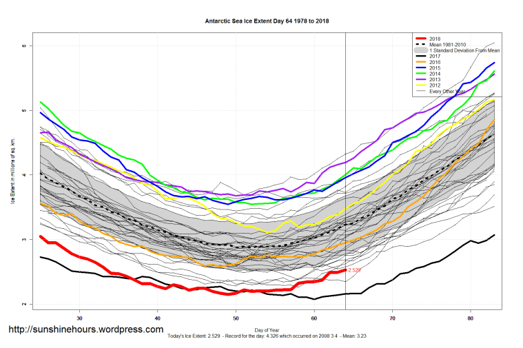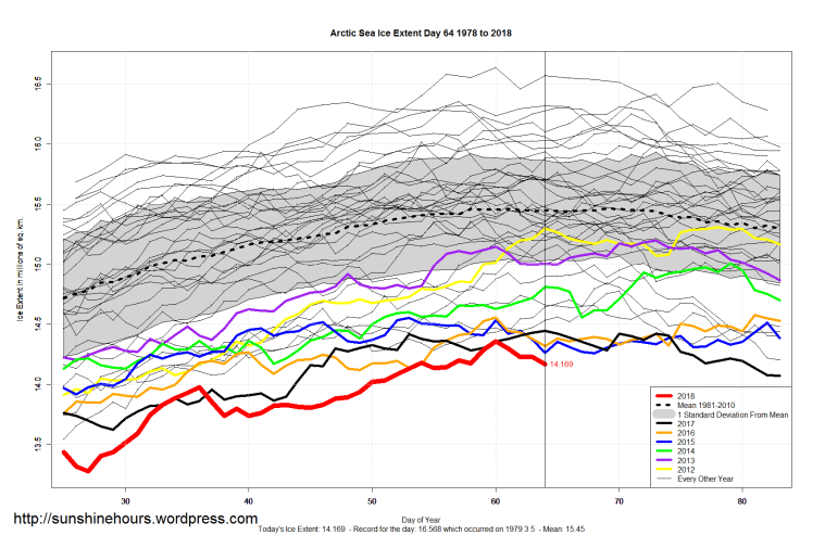 Sea Ice Extent (Global Antarctic and Arctic) – Day 64 – 2018 Published on March 6, 2018March 6, 2018 by sunshinehours1 With Mean added to description of graph. South / North Share this: Click to share on X (Opens in new window) X Click to share on Facebook (Opens in new window) Facebook Like Loading... Related