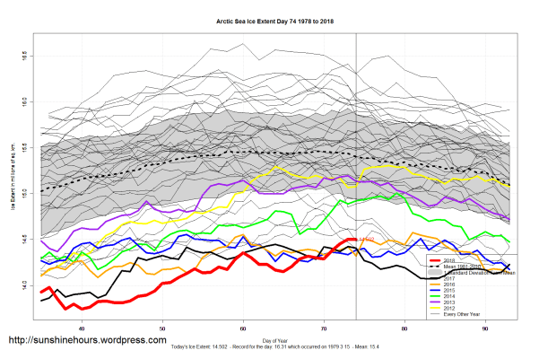 Sea Ice Extent (Global Antarctic and Arctic) – Day 74 – 2018