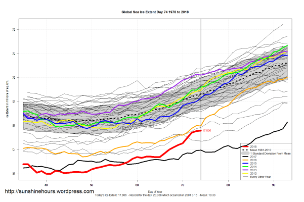 Sea Ice Extent (Global Antarctic and Arctic) – Day 74 – 2018