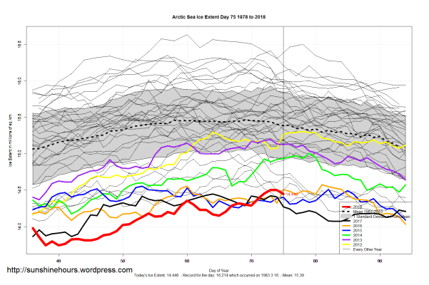 Sea Ice Extent (Global Antarctic and Arctic) – Day 75 – 2018