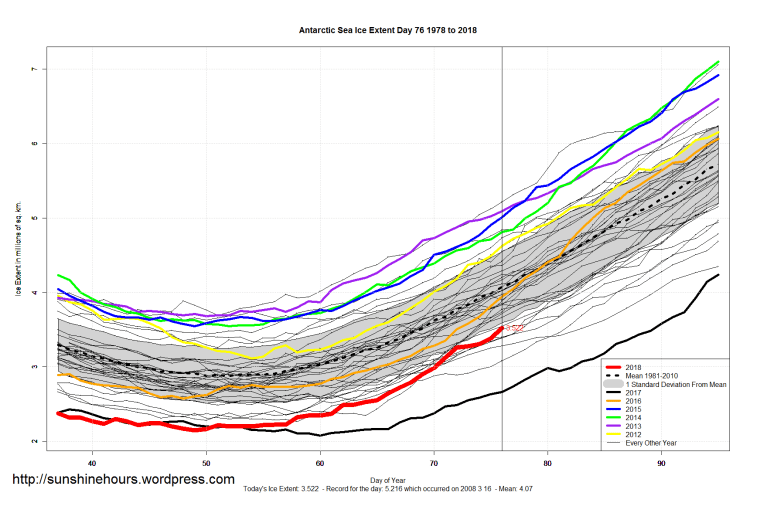 1. Interesting – seems that there is a trend in the Arctic sea ice extent reaching it’s max a little bit later in the season this year. Looks (by eye) to be around day 74-74 – so far – this year. One more little bump up, would put it even later.