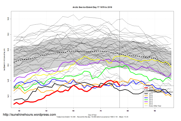 Sea Ice Extent (Global Antarctic and Arctic) – Day 77 – 2018 Published on March 19, 2018March 19, 2018 by sunshinehours1 South / North Share this: Click to share on X (Opens in new window) X Click to share on Facebook (Opens in new window) Facebook Like Loading... Related