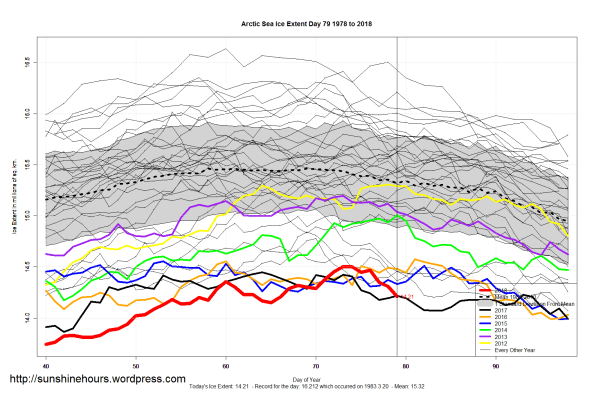 Sea Ice Extent (Global Antarctic and Arctic) – Day 79 – 2018