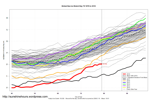 Sea Ice Extent (Global Antarctic and Arctic) – Day 79 – 2018
