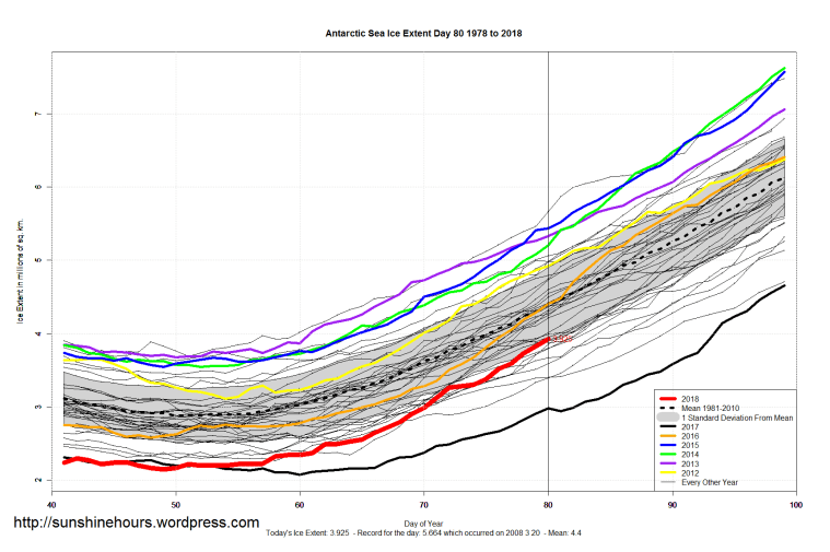 Antarctica has made an amazing recovery from 2017. As of day 80 it is 11th lowest. Almost 1,000,000 sq km more than the same day in 2017.
