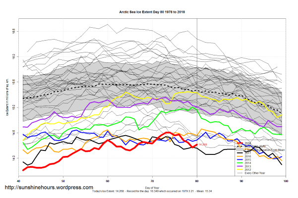 Sea Ice Extent (Global Antarctic and Arctic) – Day 80 – 2018