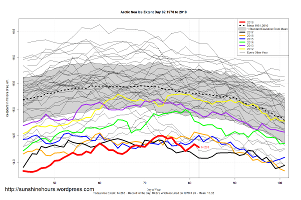Sea Ice Extent (Global Antarctic and Arctic) – Day 82 – 2018