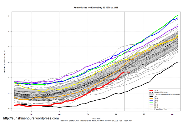 Sea Ice Extent (Global Antarctic and Arctic) – Day 83 – 2018