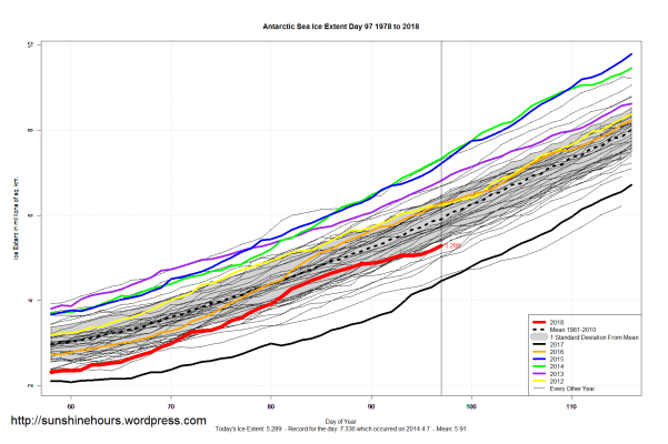 Sea Ice Extent (Global Antarctic and Arctic) – Day 97 – 2018