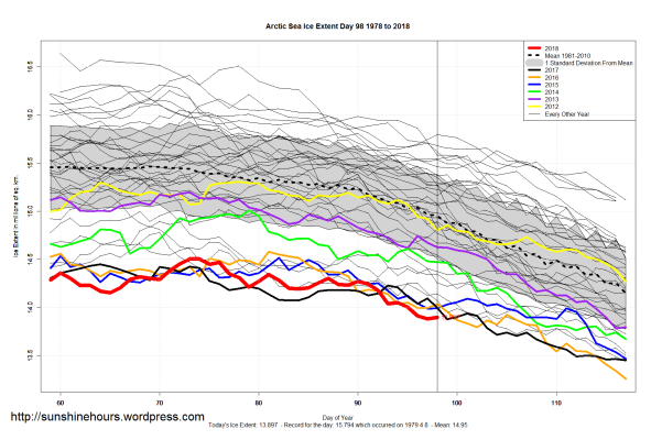 Sea Ice Extent (Global Antarctic and Arctic) – Day 98 – 2018