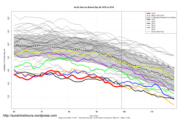 Sea Ice Extent (Global Antarctic and Arctic) – Day 99 – 2018