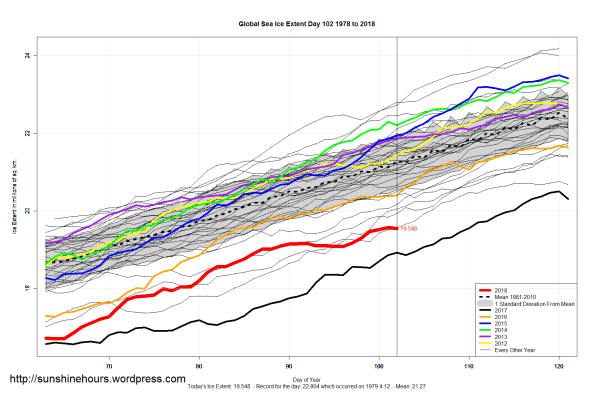 Sea Ice Extent (Global Antarctic and Arctic) – Day 102 – 2018