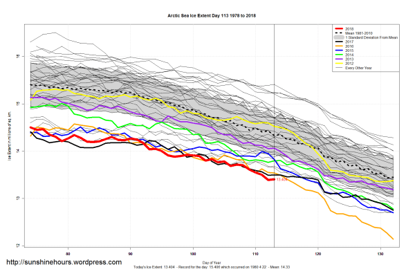 Sea Ice Extent (Global Antarctic and Arctic) – Day 113 – 2018