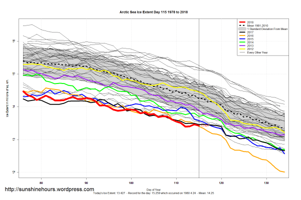 Sea Ice Extent (Global Antarctic and Arctic) – Day 115 – 2018