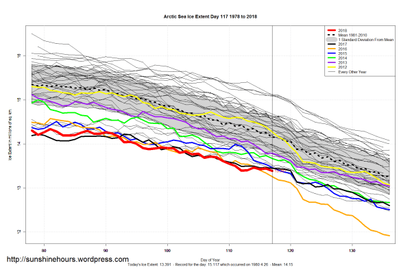 Sea Ice Extent (Global Antarctic and Arctic) – Day 117 – 2018