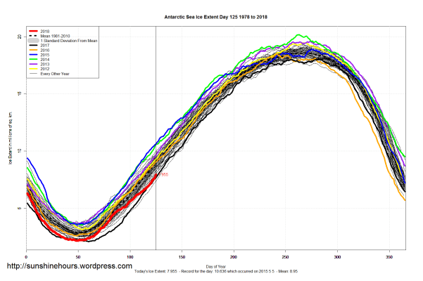 Sea Ice Extent (Global Antarctic and Arctic) – Day 125 – 2018