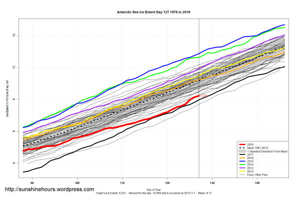 Sea Ice Extent (Global Antarctic and Arctic) – Day 127 – 2018