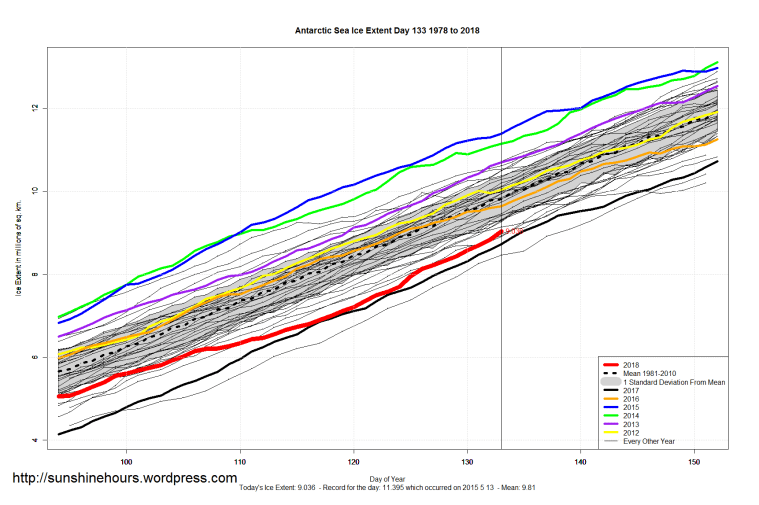 Sea Ice Extent (Global Antarctic and Arctic) – Day 133 – 2018 Published on May 14, 2018May 14, 2018 by sunshinehours1 South / North Share this: Click to share on X (Opens in new window) X Click to share on Facebook (Opens in new window) Facebook Like Loading... Related