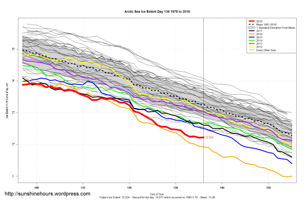 Sea Ice Extent (Global Antarctic and Arctic) – Day 136 – 2018