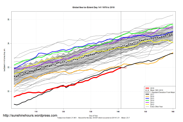 Sea Ice Extent (Global Antarctic and Arctic) – Day 141 – 2018