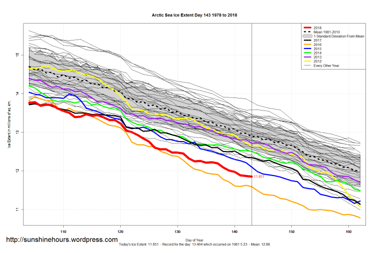 Sea Ice Extent (Global Antarctic and Arctic) – Day 143 – 2018 Published on May 24, 2018May 24, 2018 by sunshinehours1 South / North Share this: Click to share on X (Opens in new window) X Click to share on Facebook (Opens in new window) Facebook Like Loading... Related