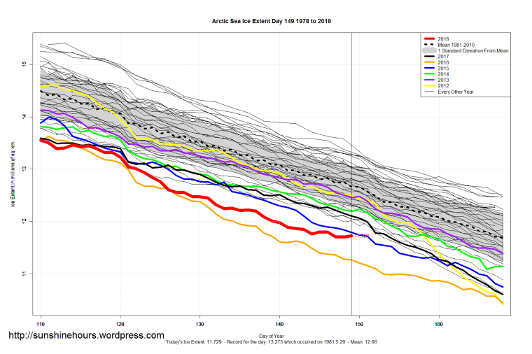 Sea Ice Extent (Global Antarctic and Arctic) – Day 149 – 2018 Published on May 30, 2018May 30, 2018 by sunshinehours1 Arctic Sea Ice Extent is almost 500,000 sq km higher than 2016. South / North Share this: Click to share on X (Opens in new window) X Click to share on Facebook (Opens in new window) Facebook Like Loading... Related