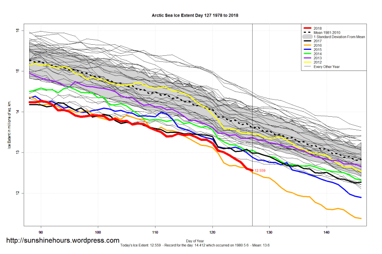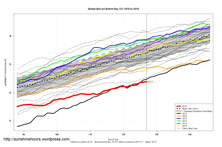 Sea Ice Extent (Global Antarctic and Arctic) – Day 127 – 2018