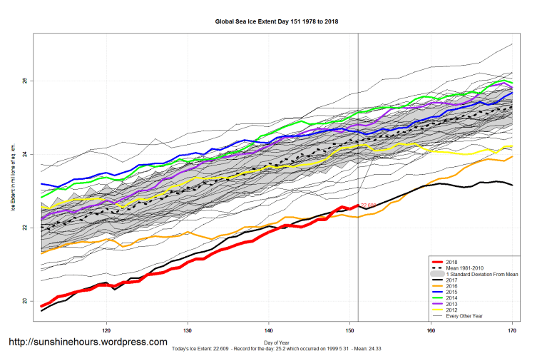 Sea Ice Extent (Global Antarctic and Arctic) – Day 151 – 2018 Published on June 1, 2018June 1, 2018 by sunshinehours1 South / North Share this: Click to share on X (Opens in new window) X Click to share on Facebook (Opens in new window) Facebook Like Loading... Related
