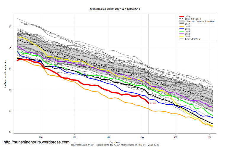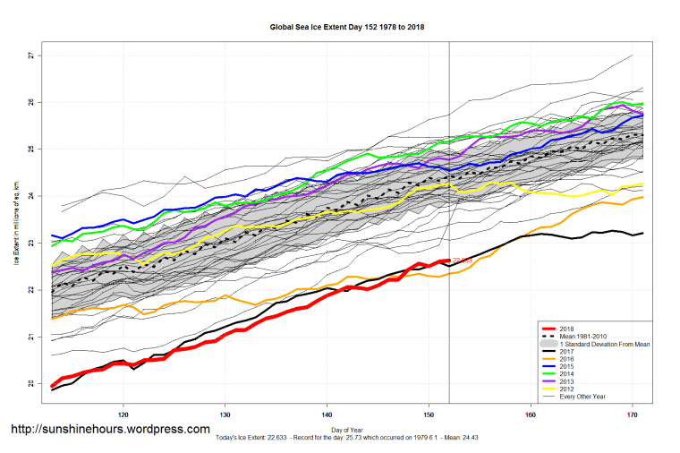 Sea Ice Extent (Global Antarctic and Arctic) – Day 152 – 2018 Published on June 2, 2018June 2, 2018 by sunshinehours1 South / North Share this: Click to share on X (Opens in new window) X Click to share on Facebook (Opens in new window) Facebook Like Loading... Related