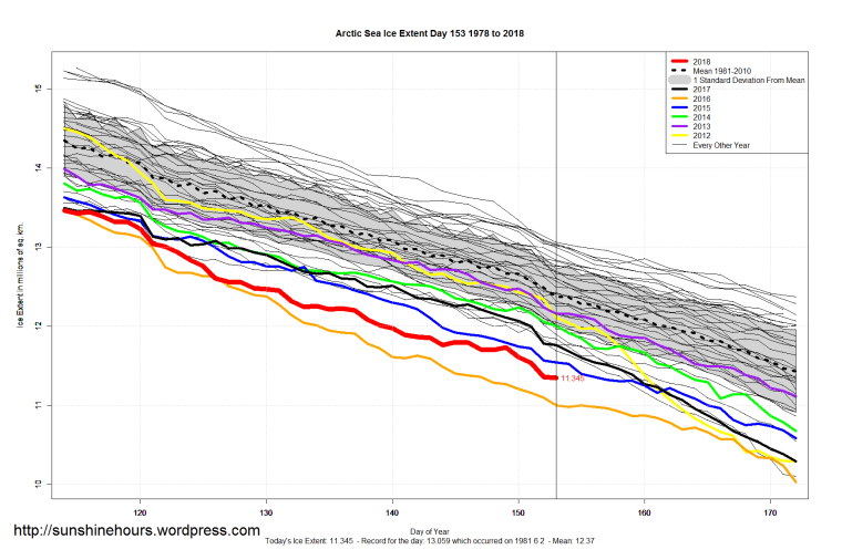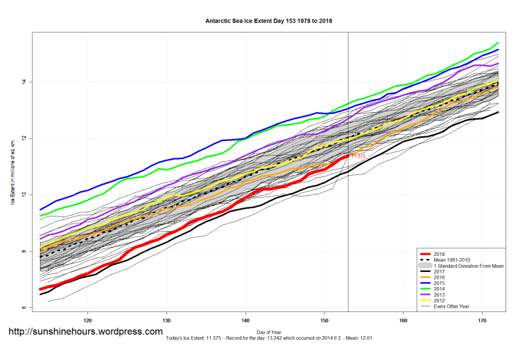 Sea Ice Extent (Global Antarctic and Arctic) – Day 153 – 2018 Published on June 3, 2018June 3, 2018 by sunshinehours1 South / North Share this: Click to share on X (Opens in new window) X Click to share on Facebook (Opens in new window) Facebook Like Loading... Related