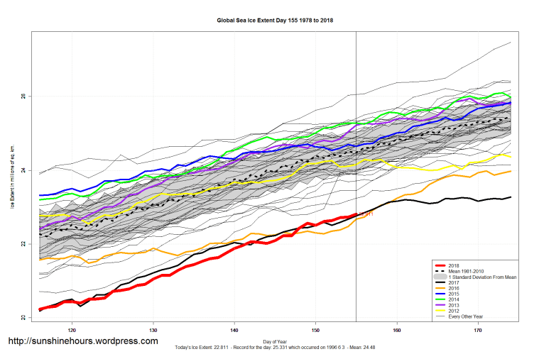 Sea Ice Extent (Global Antarctic and Arctic) – Day 155 – 2018 Published on June 5, 2018June 5, 2018 by sunshinehours1 South / North Share this: Click to share on X (Opens in new window) X Click to share on Facebook (Opens in new window) Facebook Like Loading... Related