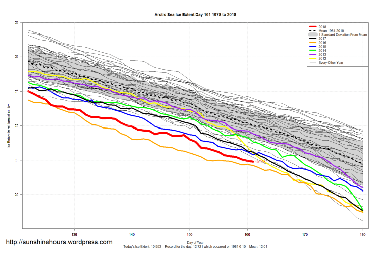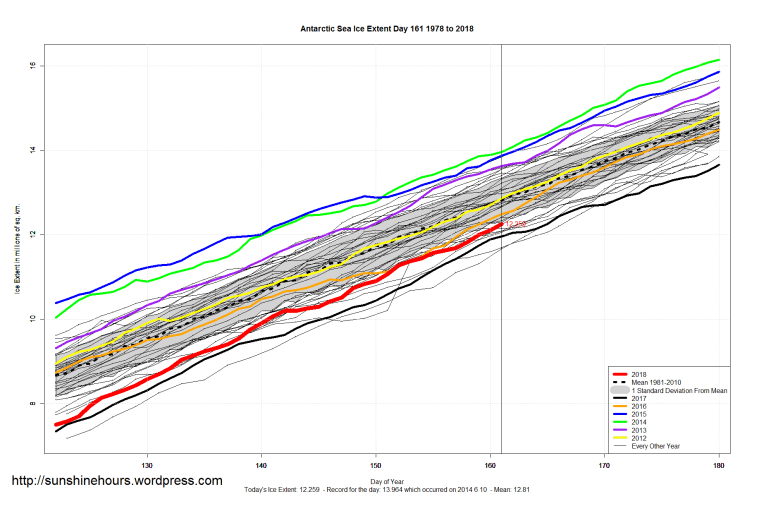 Sea Ice Extent (Global Antarctic and Arctic) – Day 161 – 2018 Published on June 11, 2018June 11, 2018 by sunshinehours1 South / North Share this: Click to share on X (Opens in new window) X Click to share on Facebook (Opens in new window) Facebook Like Loading... Related