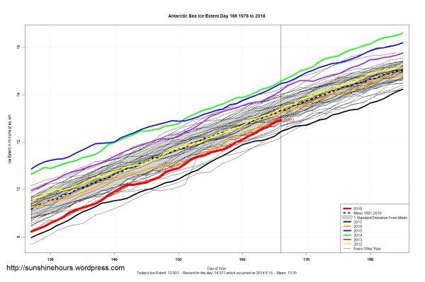 Sea Ice Extent (Global Antarctic and Arctic) – Day 166 – 2018