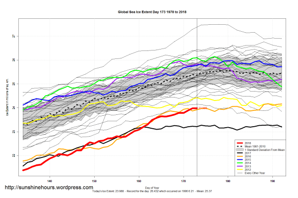 Sea Ice Extent (Global Antarctic and Arctic) – Day 173 – 2018