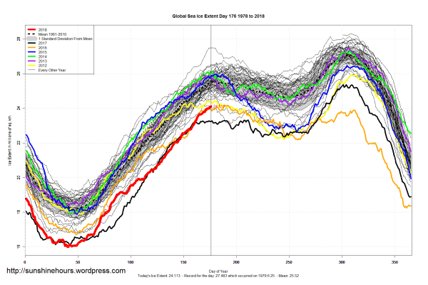 Sea Ice Extent (Global Antarctic and Arctic) – Day 176 – 2018
