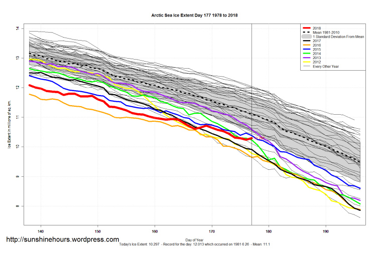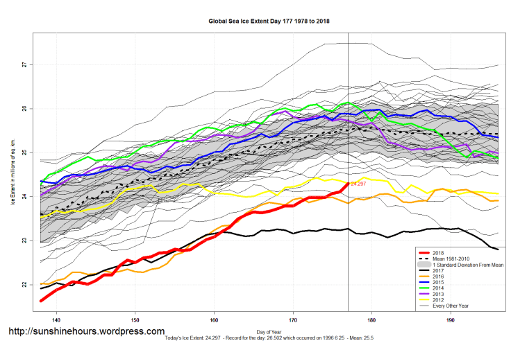 Sea Ice Extent (Global Antarctic and Arctic) – Day 177 – 2018 Published on June 27, 2018June 27, 2018 by sunshinehours1 Arctic Sea Ice higher in 2018 than same day for years 2010 2016 2012 2011 2017 2006 2014 Global Sea Ice is 1,000,000 sq km higher than last year for same day. South / North Share this: Click to share on X (Opens in new window) X Click to share on Facebook (Opens in new window) Facebook Like Loading... Related