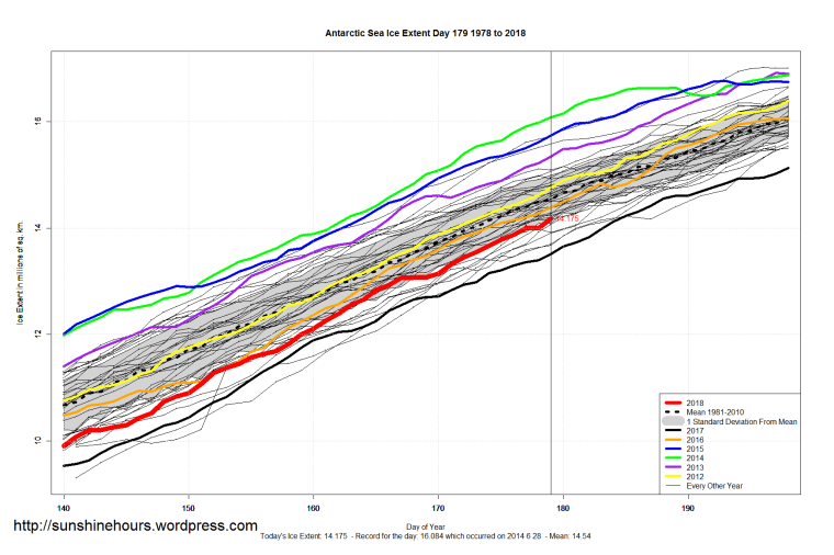 Sea Ice Extent (Global Antarctic and Arctic) – Day 179 – 2018 Published on June 29, 2018June 29, 2018 by sunshinehours1 Arctic higher than 2010 2016 2017 2012 2011 2014 and 2006 South / North Share this: Click to share on X (Opens in new window) X Click to share on Facebook (Opens in new window) Facebook Like Loading... Related