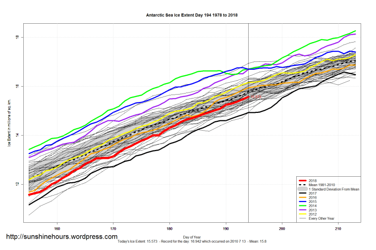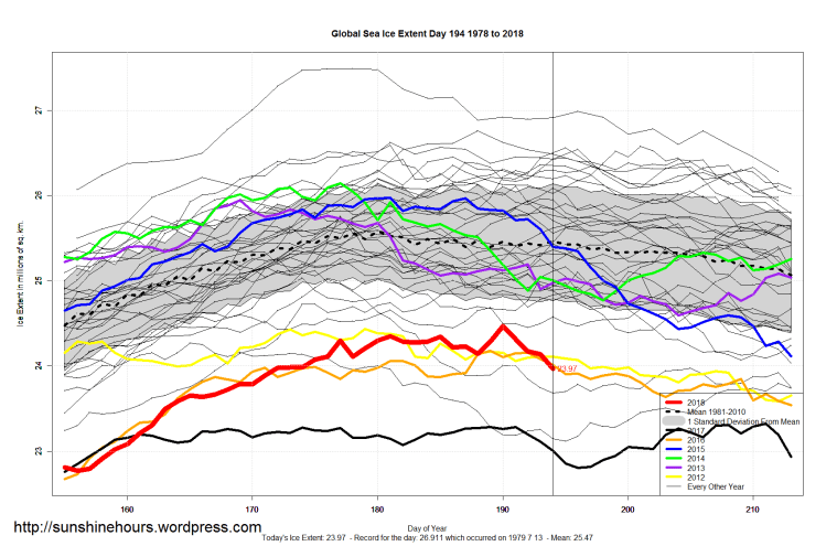 Sea Ice Extent (Global Antarctic and Arctic) – Day 194 – 2018 Published on July 14, 2018July 14, 2018 by sunshinehours1 South / North Share this: Click to share on X (Opens in new window) X Click to share on Facebook (Opens in new window) Facebook Like Loading... Related