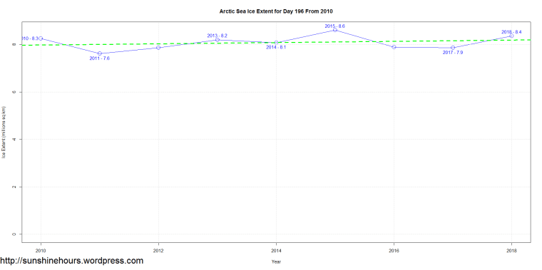 Sea Ice Extent (Global Antarctic and Arctic) – Day 196 – 2018 Published on July 16, 2018July 16, 2018 by sunshinehours1 If you graph the trend from 2010 …. it doesn’t exactly look like the end of the world. South / North Share this: Click to share on X (Opens in new window) X Click to share on Facebook (Opens in new window) Facebook Like Loading... Related
