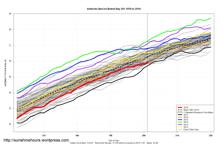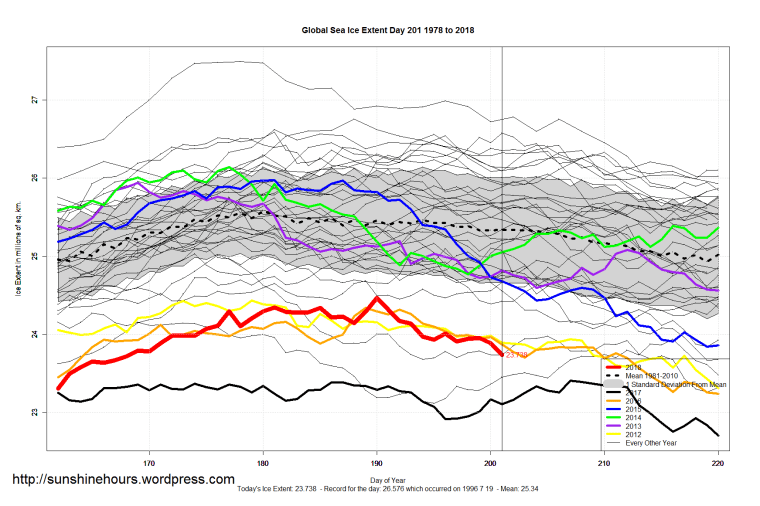 Sea Ice Extent (Global Antarctic and Arctic) – Day 201 – 2018 Published on July 21, 2018July 21, 2018 by sunshinehours1 South / North Share this: Click to share on X (Opens in new window) X Click to share on Facebook (Opens in new window) Facebook Like Loading... Related