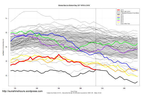Sea Ice Extent (Global Antarctic and Arctic) – Day 207 – 2018