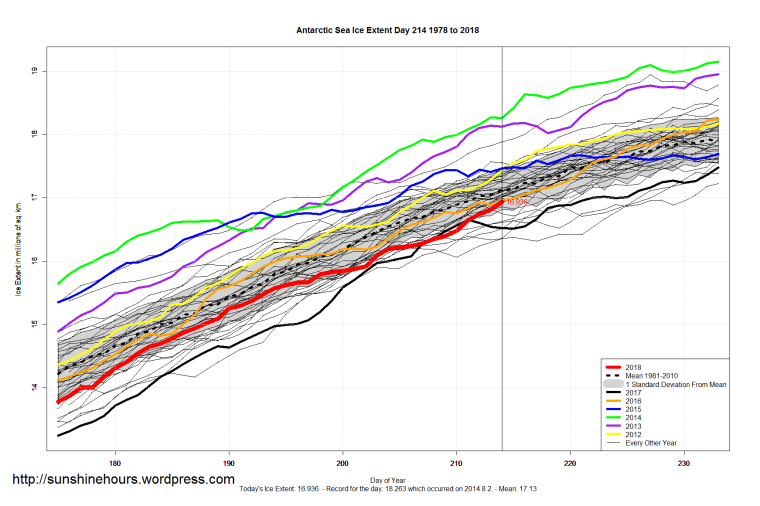 Sea Ice Extent (Global Antarctic and Arctic) – Day 214 – 2018 Published on August 3, 2018August 3, 2018 by sunshinehours1 South / North Share this: Click to share on X (Opens in new window) X Click to share on Facebook (Opens in new window) Facebook Like Loading... Related